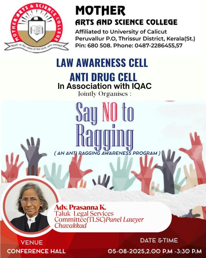 Mother Arts and Science College has a zero-tolerance towards any act of ragging. Ragging in any form is banned inside and outside the campus. Strict action will be taken against persons flouting this rule; no leniency will be shown.