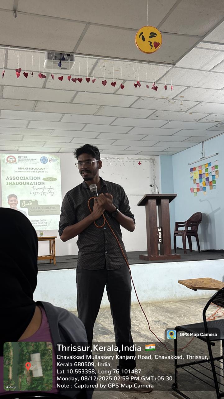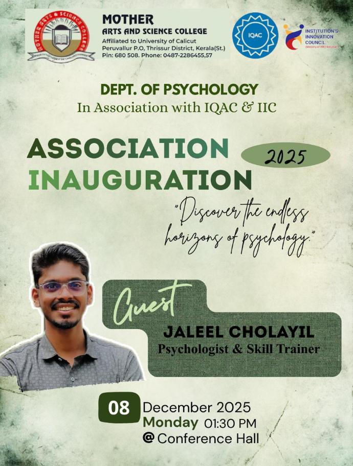Mother Arts and Science College, offers both undergraduate (B.Sc Psychology) & post graduate (M.Sc. Psychology) programmes in Psychology. B.Sc Psychology offers courses like Basic Themes in Psychology, Individual differences, Complimentary courses like statistics & human physiology in first 4 semesters and delves deeper into the subject through courses like Abnormal Psychology, Psychological Counselling, Social Psychology, Health Psychology etc. The Programme offers hands on training experience to students, in psychological measurement and testing through practical courses. The Programme also offers a small project work which help students to develop and improve both research and statistical skills.