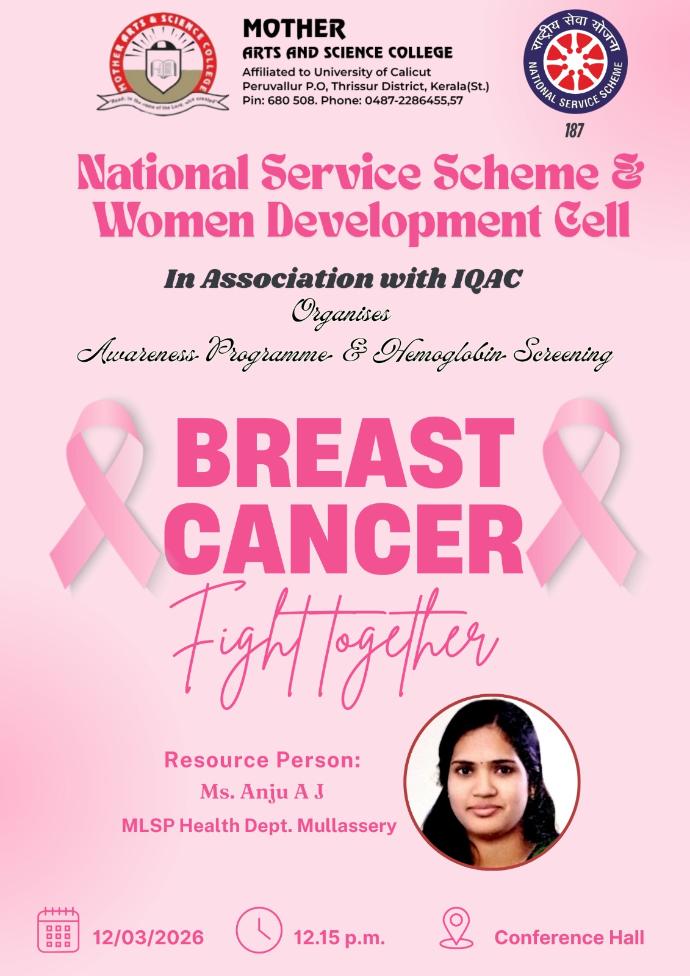 The Women's Development Cell is a statutory body for the prevention and action against sexual harassment of women. The formation of a college-level women's Development Cell was made mandatory by UGC and the university. The Women's Development Cell aims to promote awareness of gender equality and work towards gender sensitization in society, particularly among students. The motto of the Women Development Cell of Mother Arts and Science College is to empower women educationally, socially, and economically. The Women's Development Cell creates social awareness about the problems of women, in particular regarding gender discrimination. To uplift the girls socially and intellectually, the Women Development Cell conducts various awareness programmes (health, Legal, Entrepreneurship, defence, techniques, etc.) in order to equip them with the right knowledge for a life of Equality, empowerment, and Professional Success.